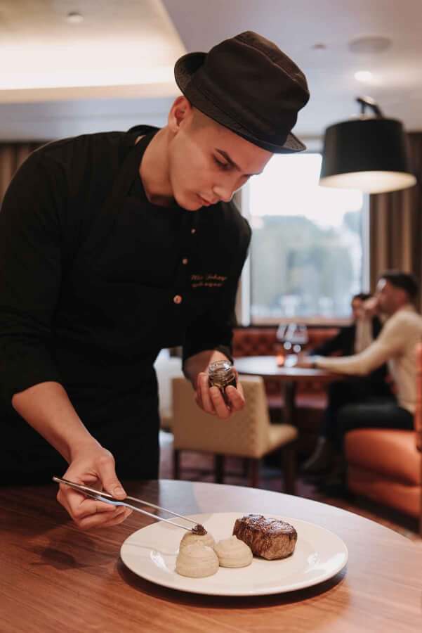 U srcu hotela nalazi se The Steak House, restoran koji nije samo mesto za obrok, već destinacija za sebe. Enterijer ne pokušava da imitira planinsku kolibu. On je moderan i sofisticiran, sa akcentima koji sugerišu da je fokus isključivo na onome što je ispred vas – na vrhunskom obroku i vrhunskom društvu. Zaboravite na klasične planinske restorane sa teškim stolnjacima i predvidljivim menijem. Ovde se estetika tanjira nadmeće sa lepotom planinskog pejzaža koji se vidi kroz prozore.